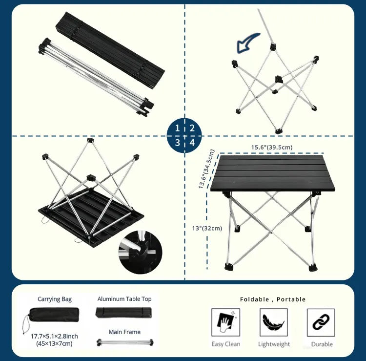 this folding camping table features reinforced legs with stable foot caps that prevent folding, bending, or detaching. It remains steady on varied terrain without tipping over. The triangular support structure and robust joints enable the table to hold up to 55 pounds, making it reliable for picnics, outdoor cooking, and camping use.